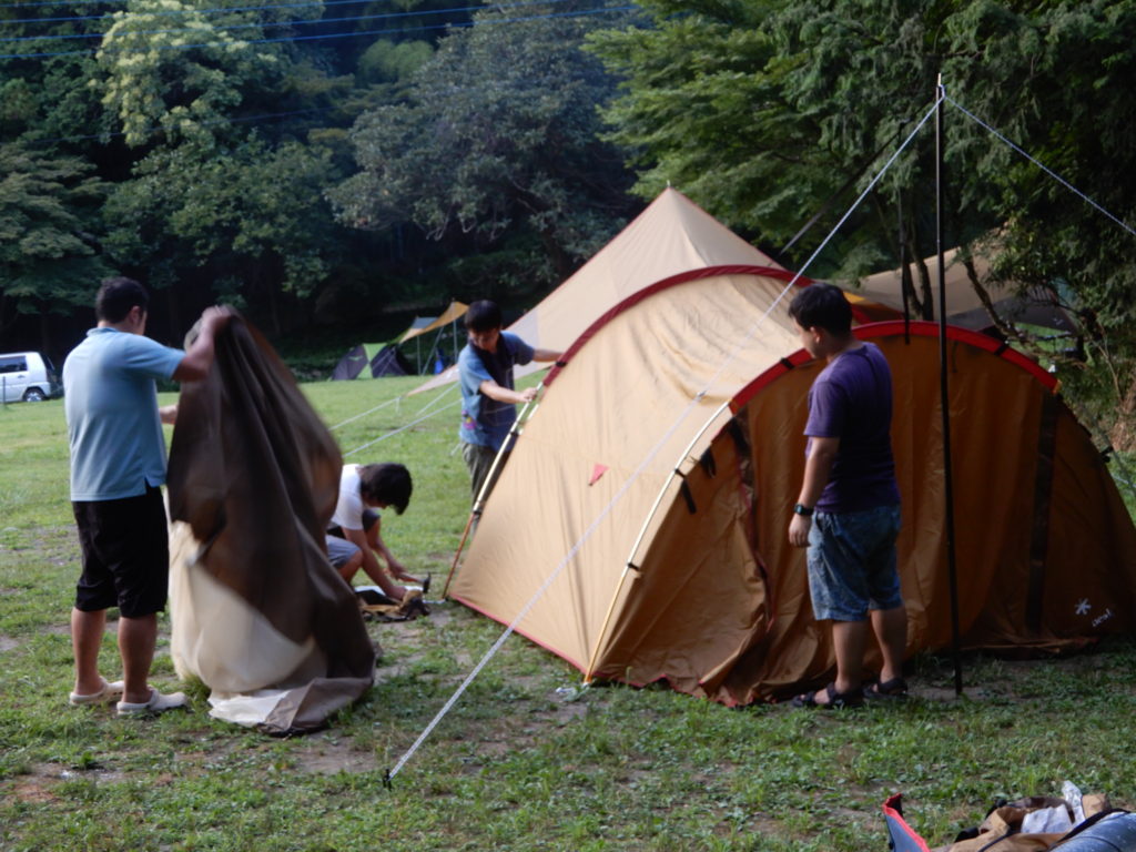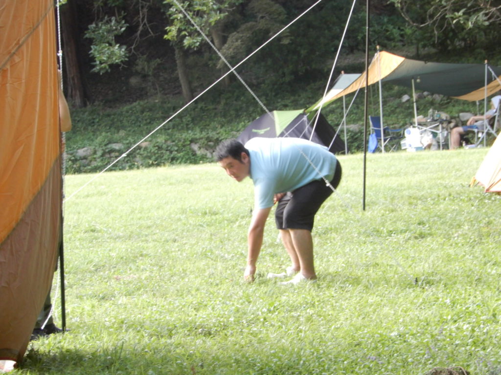 テント設営隊長の木田さん、吹き出す汗も気にせず精力的な活動