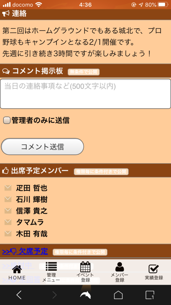 去年末で野球などの出欠運用が停止し